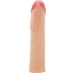 Aumente el tamaño de su pene con esta funda para el pene de placer. Fabricada con material ultra realista para un placer realista. La superficie externa está texturizada con venas realistas y presenta una cabeza bulbosa para garantizar que su amante experimente sensaciones naturales. Un canal interno suave abraza su erección para un máximo contacto y estimulación.