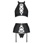 L39ensemble Nancy est un ensemble trois pièces de Passion, comprenant un haut dos nu, un porte-jarretelles et un string aux coupes audacieuses. Le tout est réalisé en cuir noir, orné de nombreuses rayures croisées qui révèlent des qualités féminines.